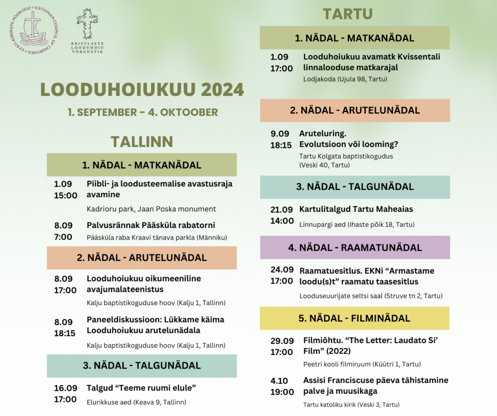 Eesti Kirikute Nõukogu tähistab looduhoiukuud temaatilisteks nädalateks jagatud sündmustega Tallinnas ja Tartus. EKN kutsub kristlasi üritustel osalema, neid oma kogudustes korraldama ja ka iseseisvalt looduhoiu üle mõtisklema.